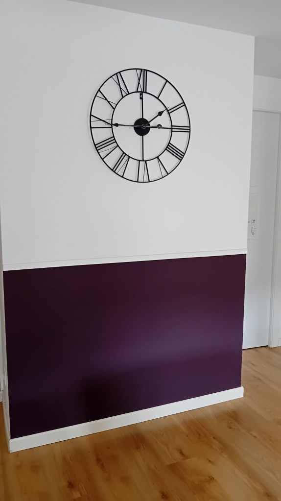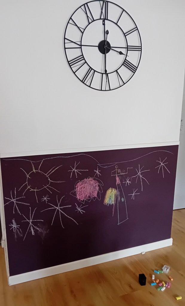 I bought a can of chalkboard paint only to found out at home I got a purple tint instead of black. No problem, purple looks good too! I painted a few layers and I added a trim on the upper side to define the drawing area. That was basically it. It adds a fun space in the house and hopefully from now on they will only draw at this dedicated chalkboard wall (a mother can dream, right?).
