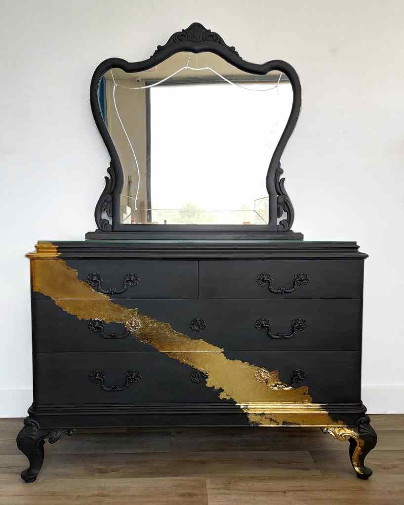 After cleaning and sanding the piece, we painted it in Athenian black chalk paint from Annie Sloan and sealed it with varnish. The inside of the drawers were painted light grey to match the wallpaper we added to the bottom of the drawers. We kept the original hardware but spraypainted it black. Then we got to the most exciting part, where we applied gold leaf from one side of the bottom up to the other side of the piece, continuing on the top. We added a glass top to give better protection and to give an extra touch of luxury.
