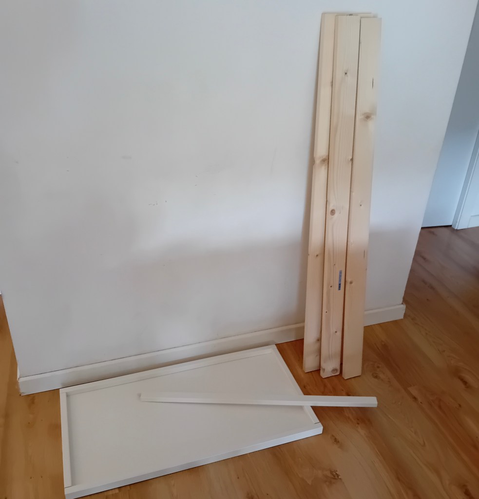 It was time to get rid of our baby changing table, and on its place I wanted to have a Montessori style clothing rack for our children’s jackets and shoes. New these type of racks are surprisingly expensive, so it got me thinking.. could I use the changing table to make one myself? The answer is yes! I only needed get two long pieces of wood for the legs. The bar and the base that serves as a shoe shelve are from the changing table.