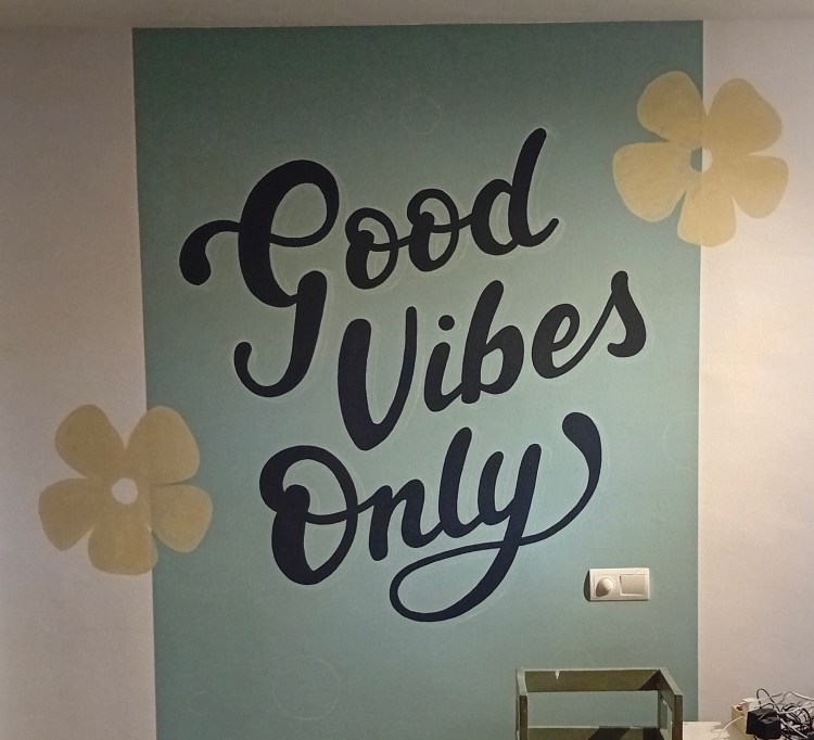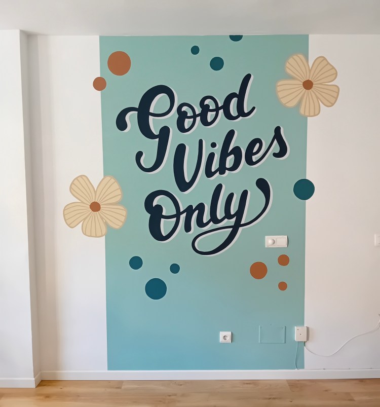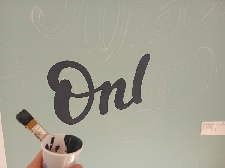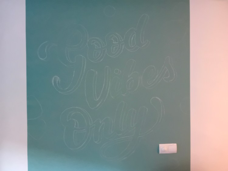 One side of our living room didn’t have much purpose and the wall was very boring, I just had to do something about it. Now it has become a pleasant new working area for me, with a bright, happy quote painted on the wall. I made a sketch first, then worked the sketch out in Procreate on the Ipad. Using a projector I could trace the lettering with chalk on the wall after which I painted everything bit by bit.