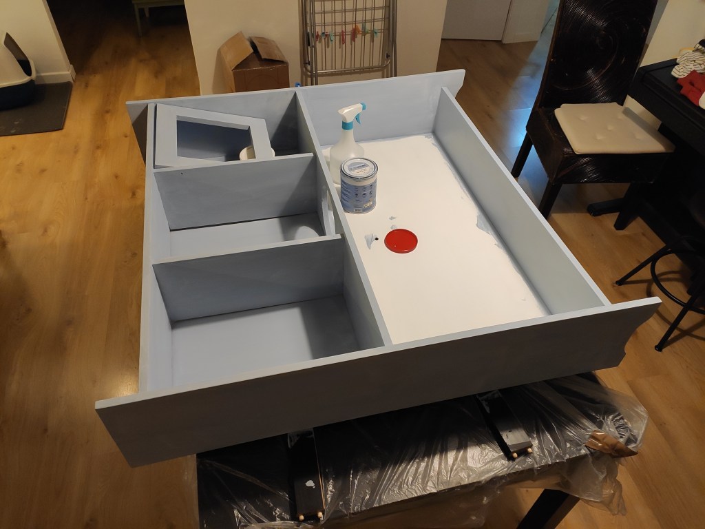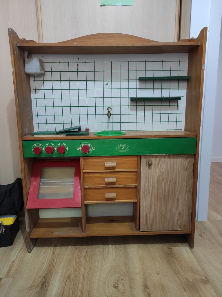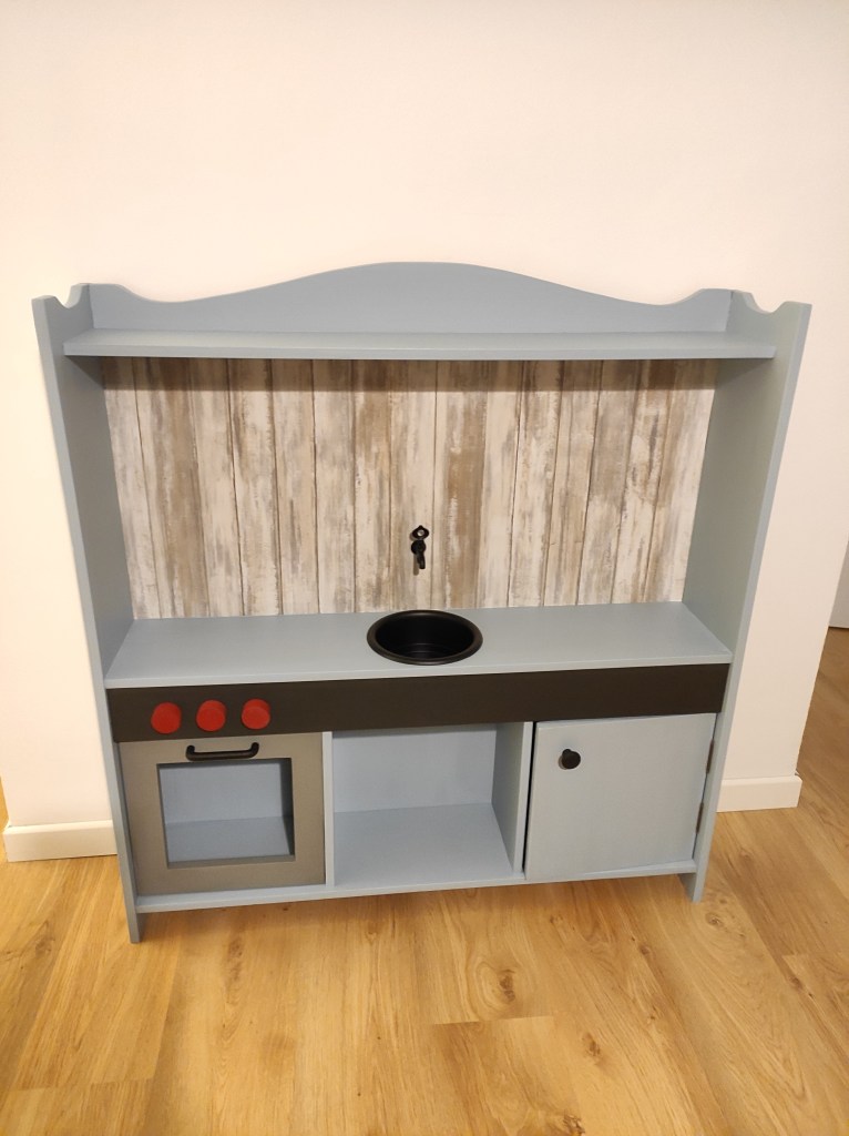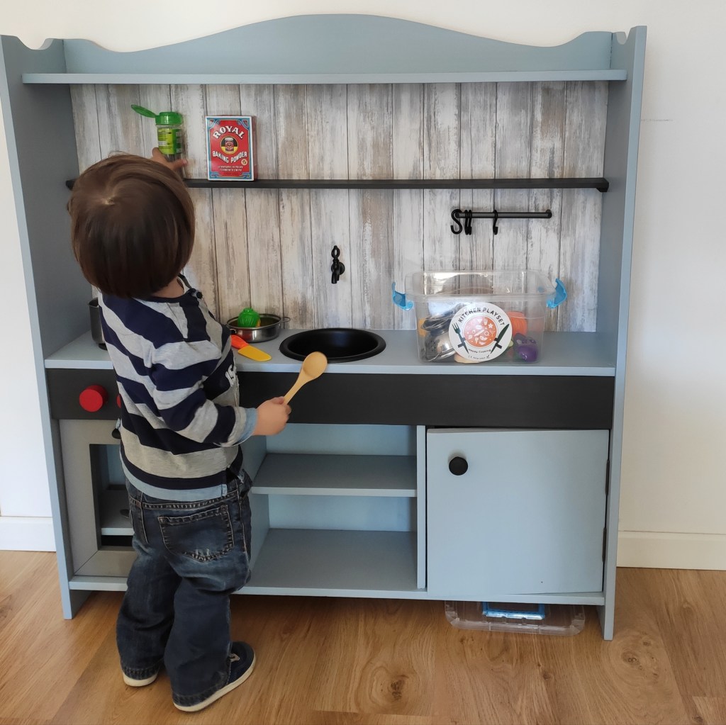 When my partner came home picking up this old play kitchen, I was a bit shocked about the bad state it was in. I almost threw it away, but as it was meant to give to our son for his birthday, I gave it a try anyway. It cost me lots of time, sweat and tears (I also had to shorten the whole thing else he wouldn’t be able to reach the counter!) but I managed to create a beautiful, modern play kitchen that my son loves to play with.